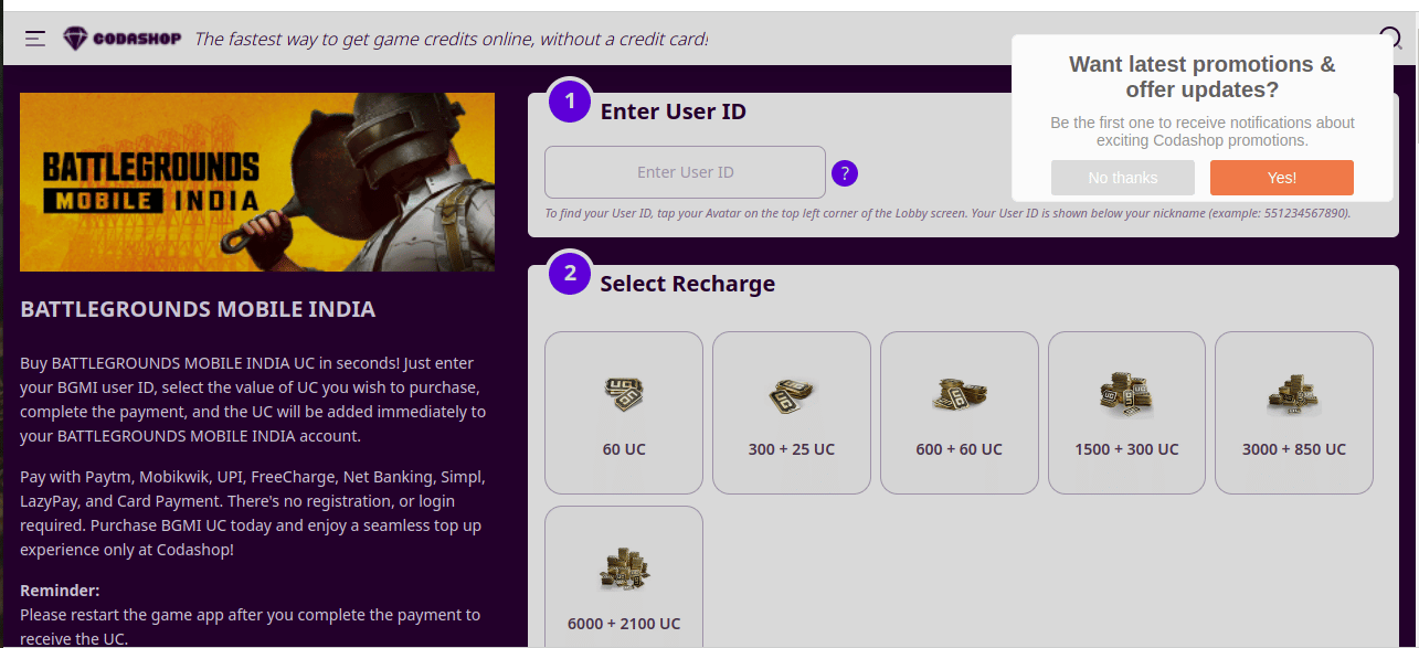 codashop is one of t the most popular option for purchasing gaming services. It is used by millions of gamers. Not only for PUBG but you can even use codashop for free fire diamonds topup. The process of purchasing BC is very simple in codashop.